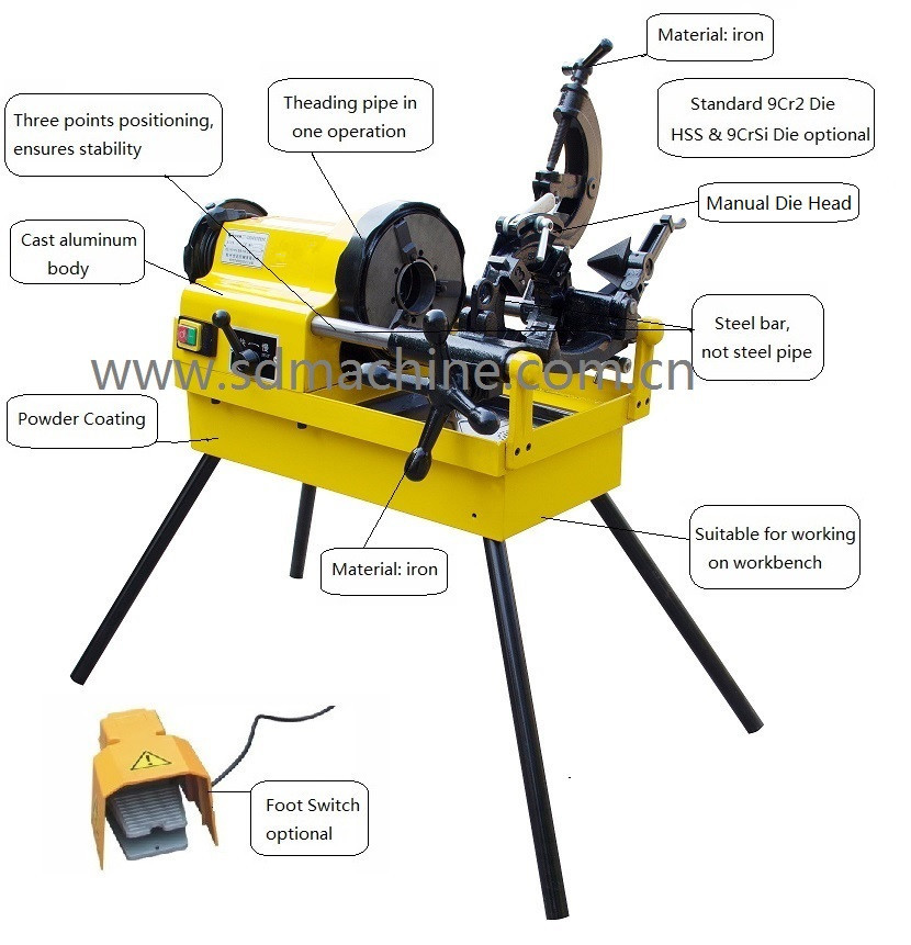 ♦50A quick-open die head and 2.1/2”-3” quick-open die head, could process BSPT, NPT, or Metric threads by exchanging dies.