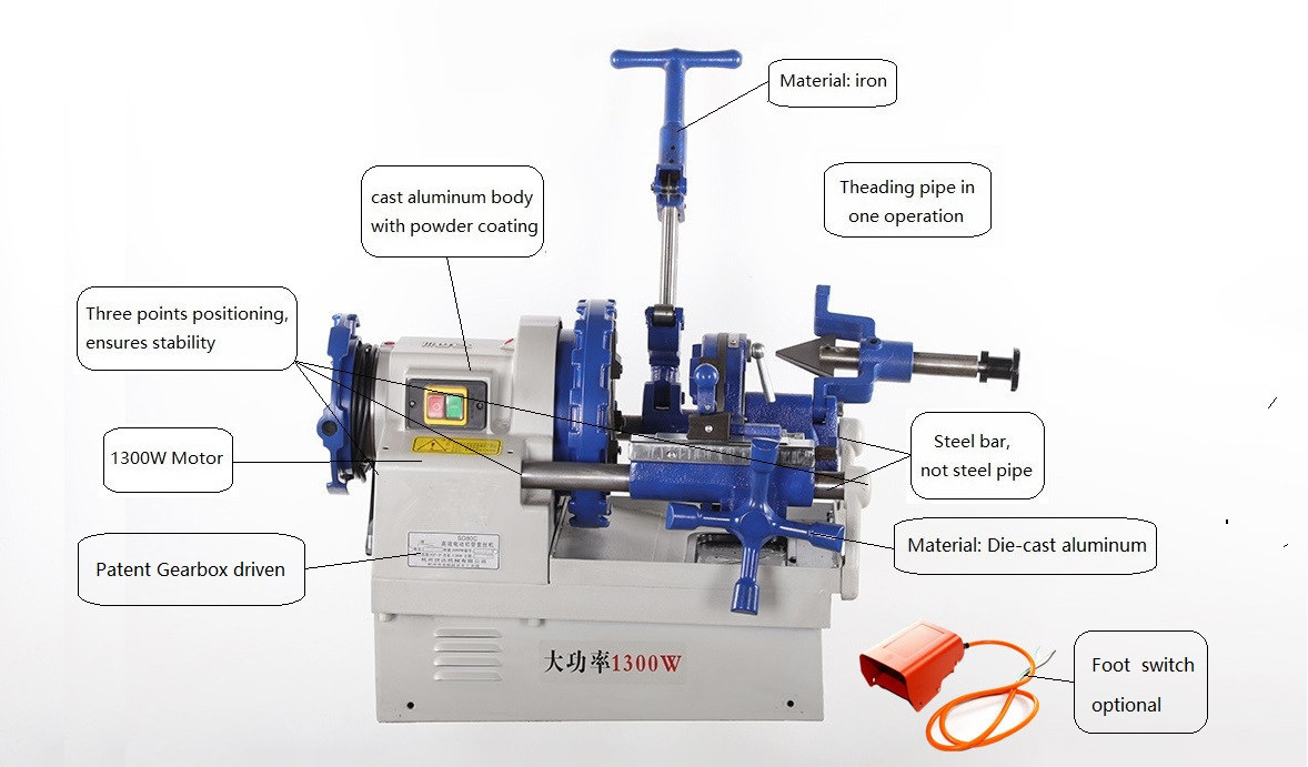 ♦ 1300W Motor, ensures full size threading completed in one operation.